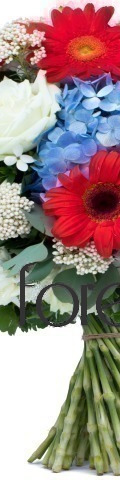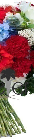 Finished in eye-catching shades of red, white and blue, the American Fiesta Handtied Bouquet is a patriotic floral arrangement for friends, loved ones and business colleagues. Bursting with colourful blooms, it includes 5 red carnations, 2 red gerberas, 2 white roses, 2 white carnations, 1 blue hydrangea, white bouvardia, gypsophila, and seasonal foliage.